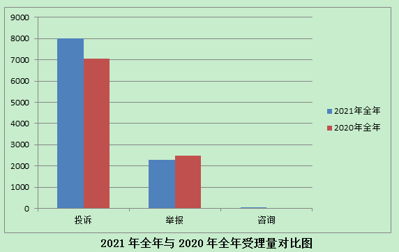 2021年全年共受理消费者投诉8015件,与去年全年相比上升了13.5%。