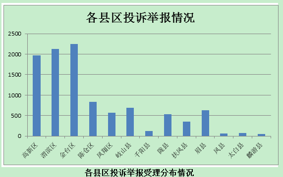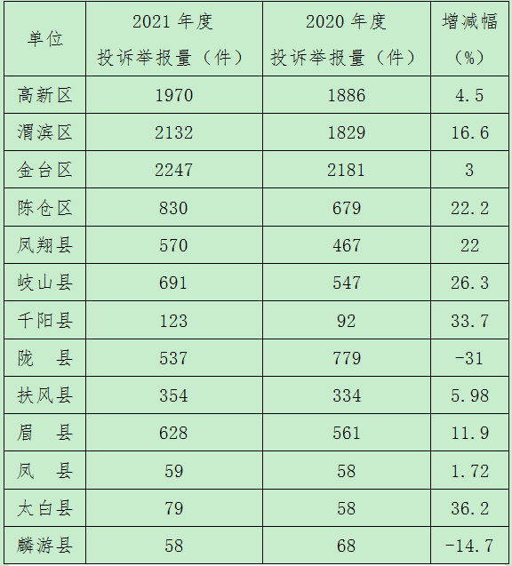 2021年全年金台区、渭滨区、高新区投诉举报位居全市前三位。投诉举报量相较去年增幅较大的是太白县、千阳县、岐山县(详见下表):