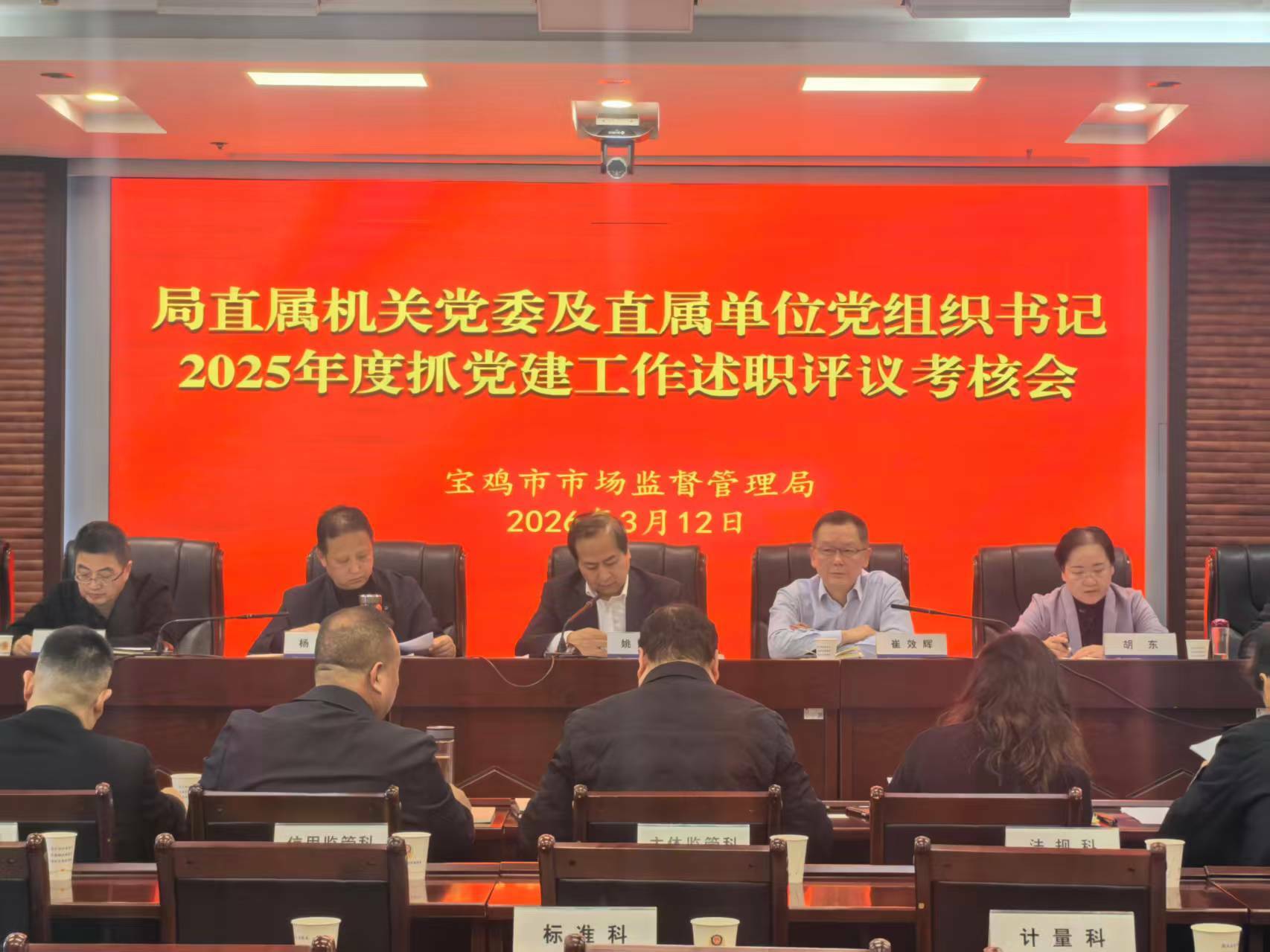 3月12日,宝鸡市市场监管局召开党组(扩大)会议,专题听取局直属机关党委书记及直属单位党组织书记2025年度抓党建工作述职,并开展民主评议考核。市市场监管局党组书记、局长姚建平主持会议并讲话。