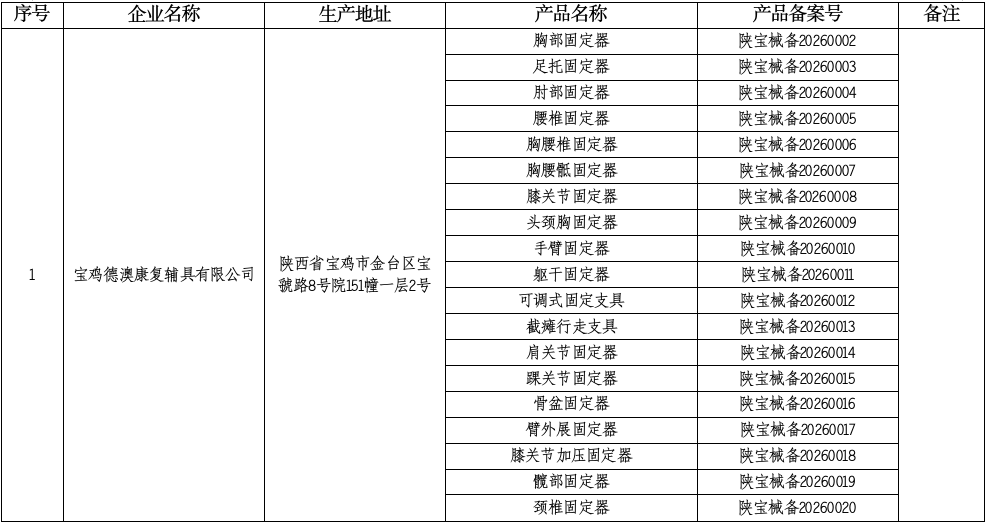 根据《医疗器械监督管理条例》(国务院令第739号)和国家药监局《关于第一类医疗器械备案有关事项的公告》(2022年第62号)相关规定,对宝鸡德澳康复辅具有限公司的胸部固定器等19个第一类医疗器械产品备案资料进行了形式审查,符合备案要求,现将备案信息予以公示。