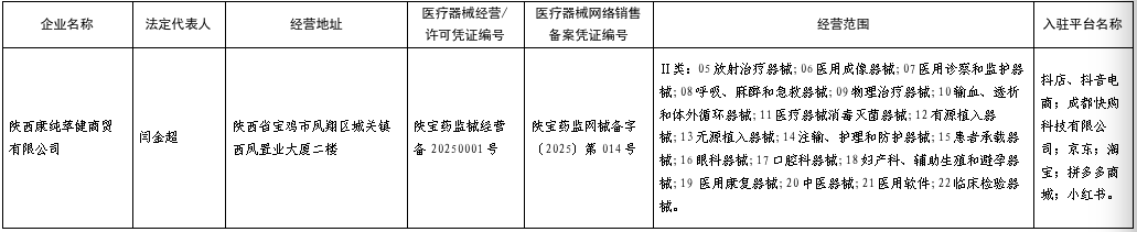 根据《医疗器械监督管理条例》、《医疗器械经营监督管理办法》和《医疗器械网络销售监督管理办法》等规定,现对陕西康纯萃健商贸有限公司的医疗器械网络销售备案信息予以公示(首次备案)。