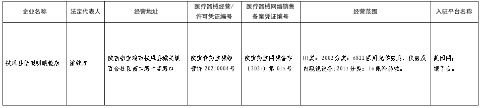 根据《医疗器械监督管理条例》、《医疗器械经营监督管理办法》和《医疗器械网络销售监督管理办法》等规定,现对扶风县佳视明眼镜店的医疗器械网络销售备案信息予以公示(首次备案)。