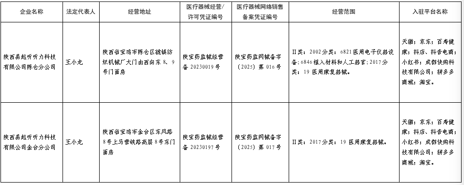 根据《医疗器械监督管理条例》、《医疗器械经营监督管理办法》和《医疗器械网络销售监督管理办法》等规定,现对陕西易起听听力科技有限公司陈仓分公司等2家企业的医疗器械网络销售备案信息予以公示(首次备案)。