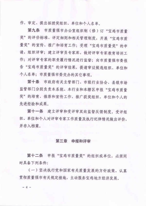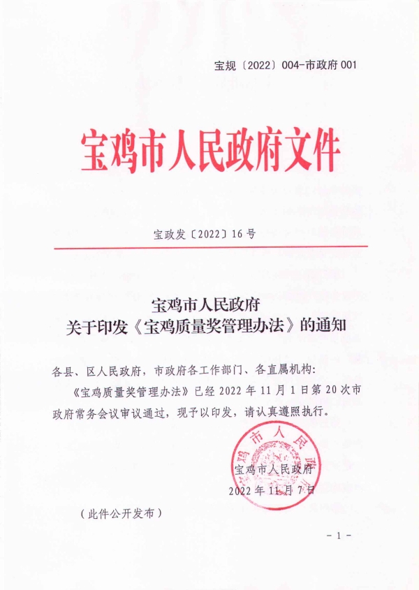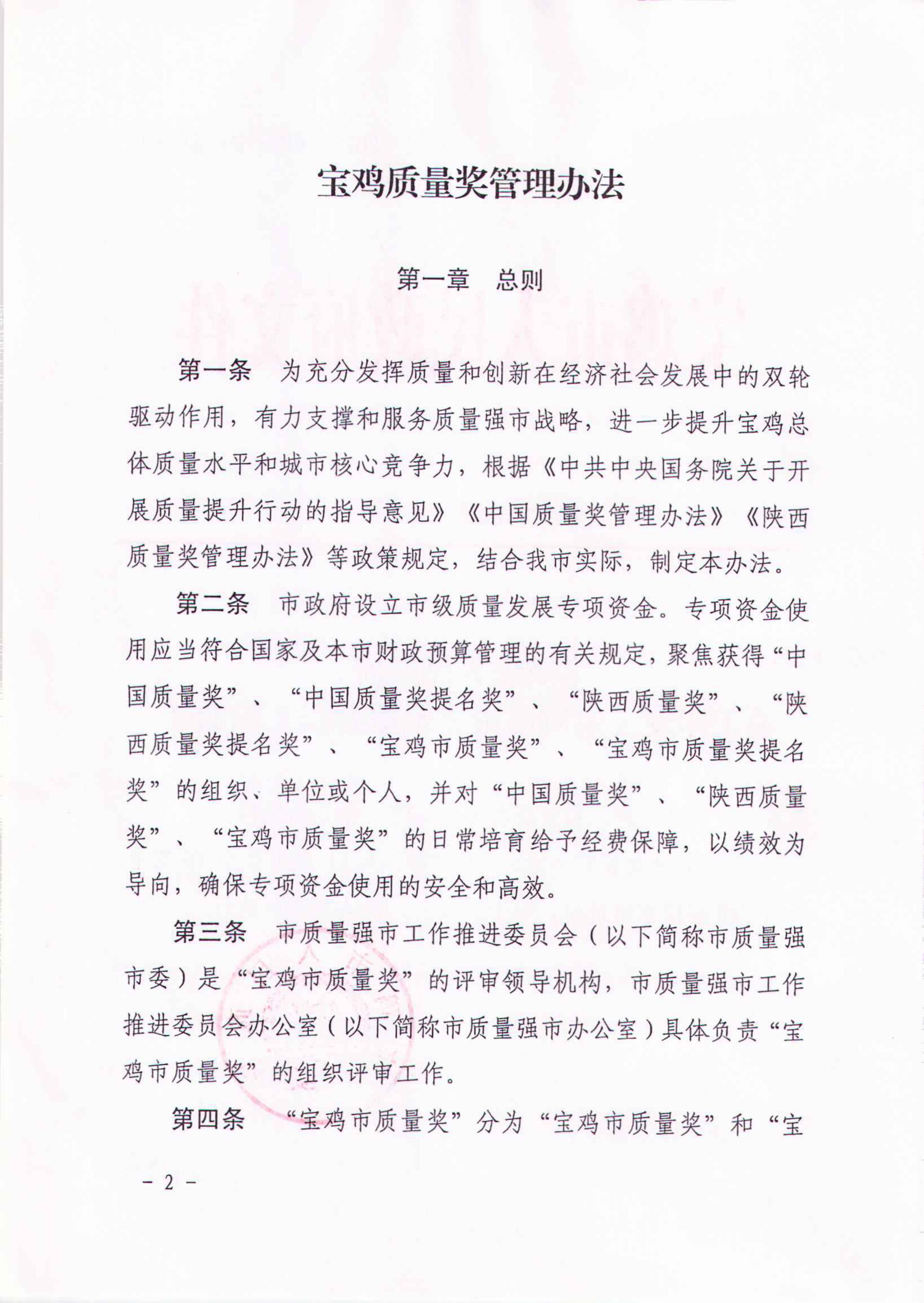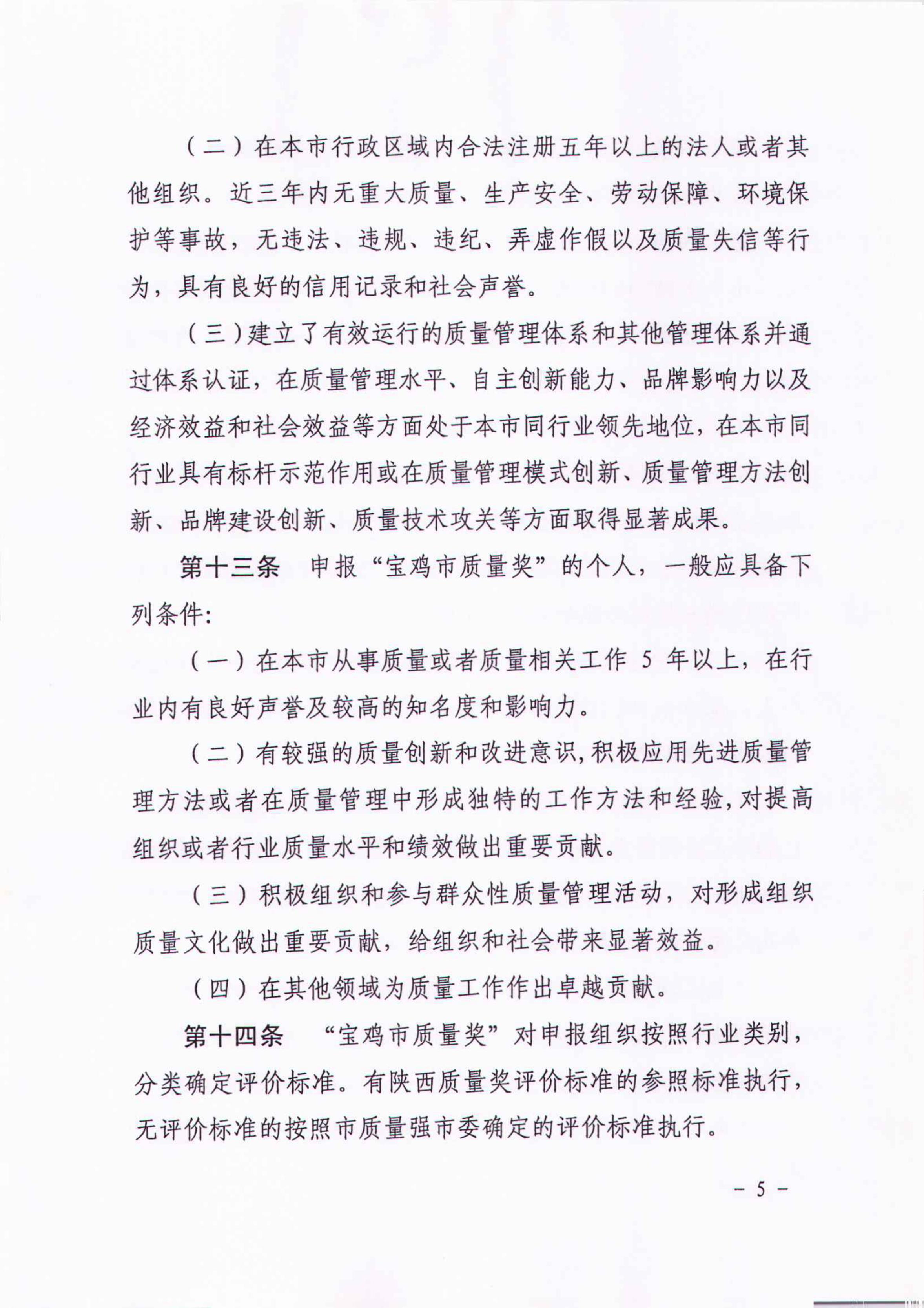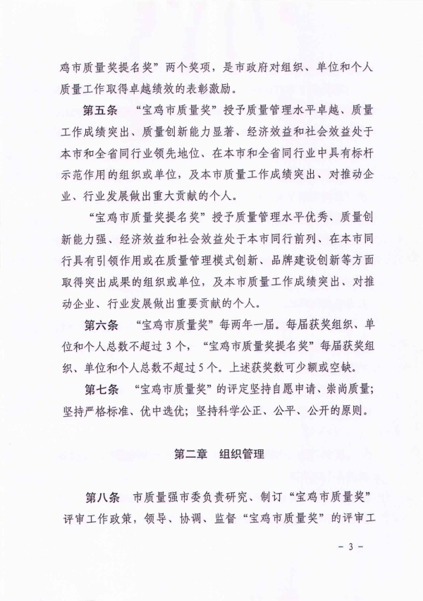 宝鸡市人民政府关于印发《宝鸡质量奖管理办法》的通知